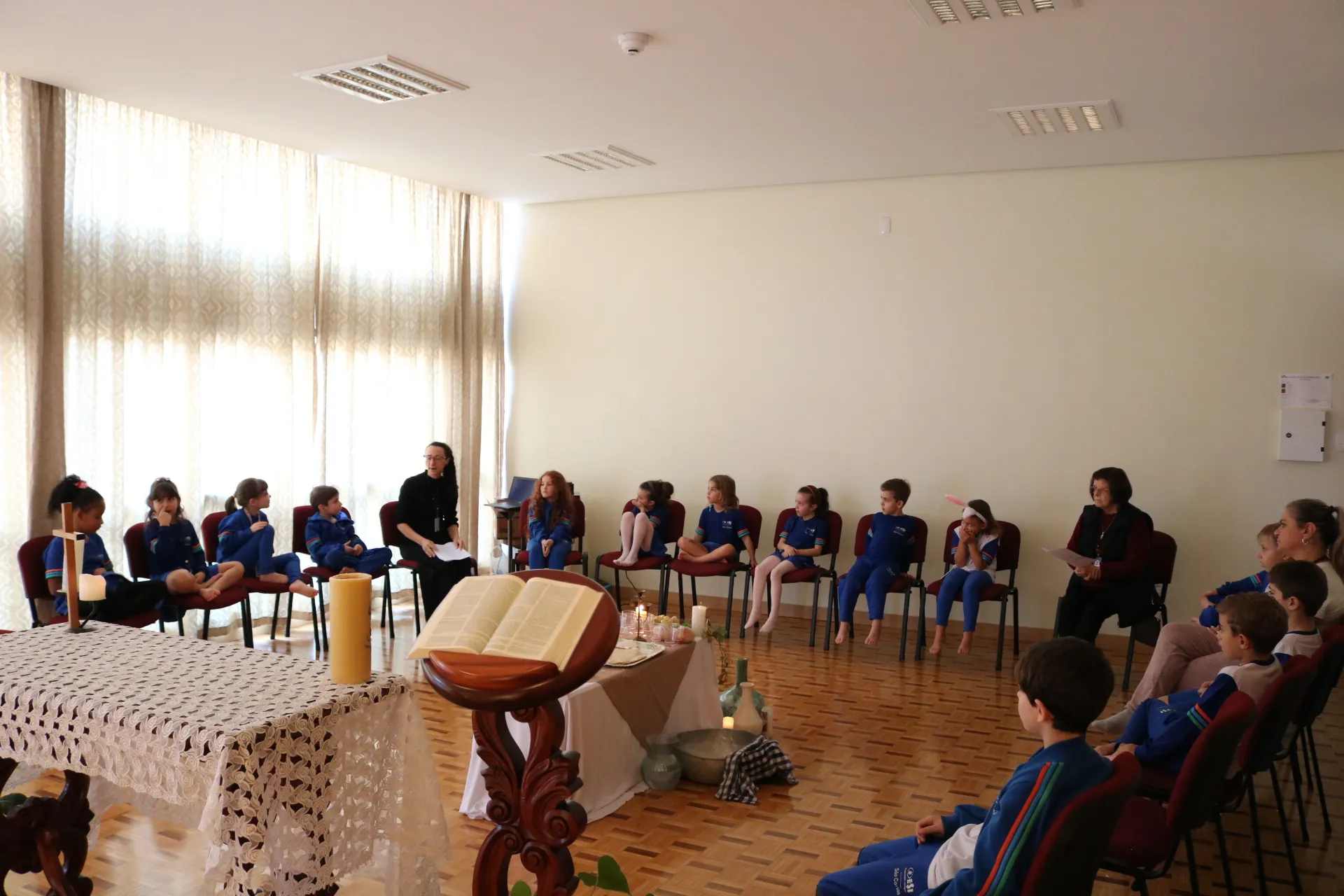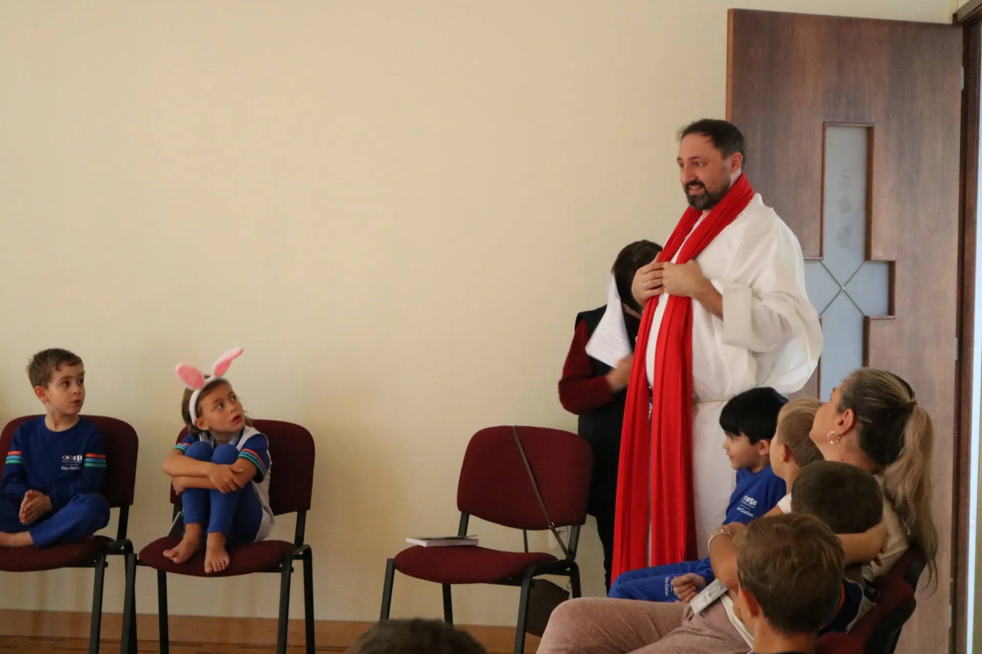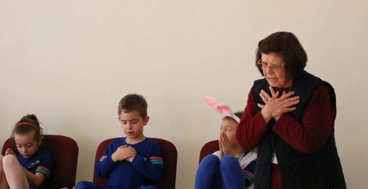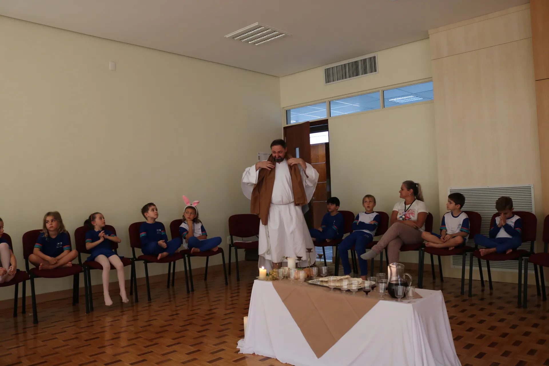 Através da encenação, as crianças puderam compreender, com sensibilidade e encantamento, o verdadeiro significado da Páscoa: o amor que se doa, o serviço ao próximo e a presença viva de Jesus em nosso meio.