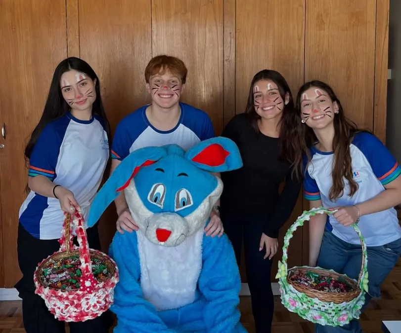 Já o Grêmio Estudantil trouxe muita alegria e acolhida ao turno da tarde: passaram de sala em sala com o “coelhão” distribuindo balinhas, para o intervalo, levaram música, sorrisos e pintura facial, transformando a escola em um espaço cheio de coelhinhos felizes, abraços espontâneos e muito carinho. 🐰🎶🎨