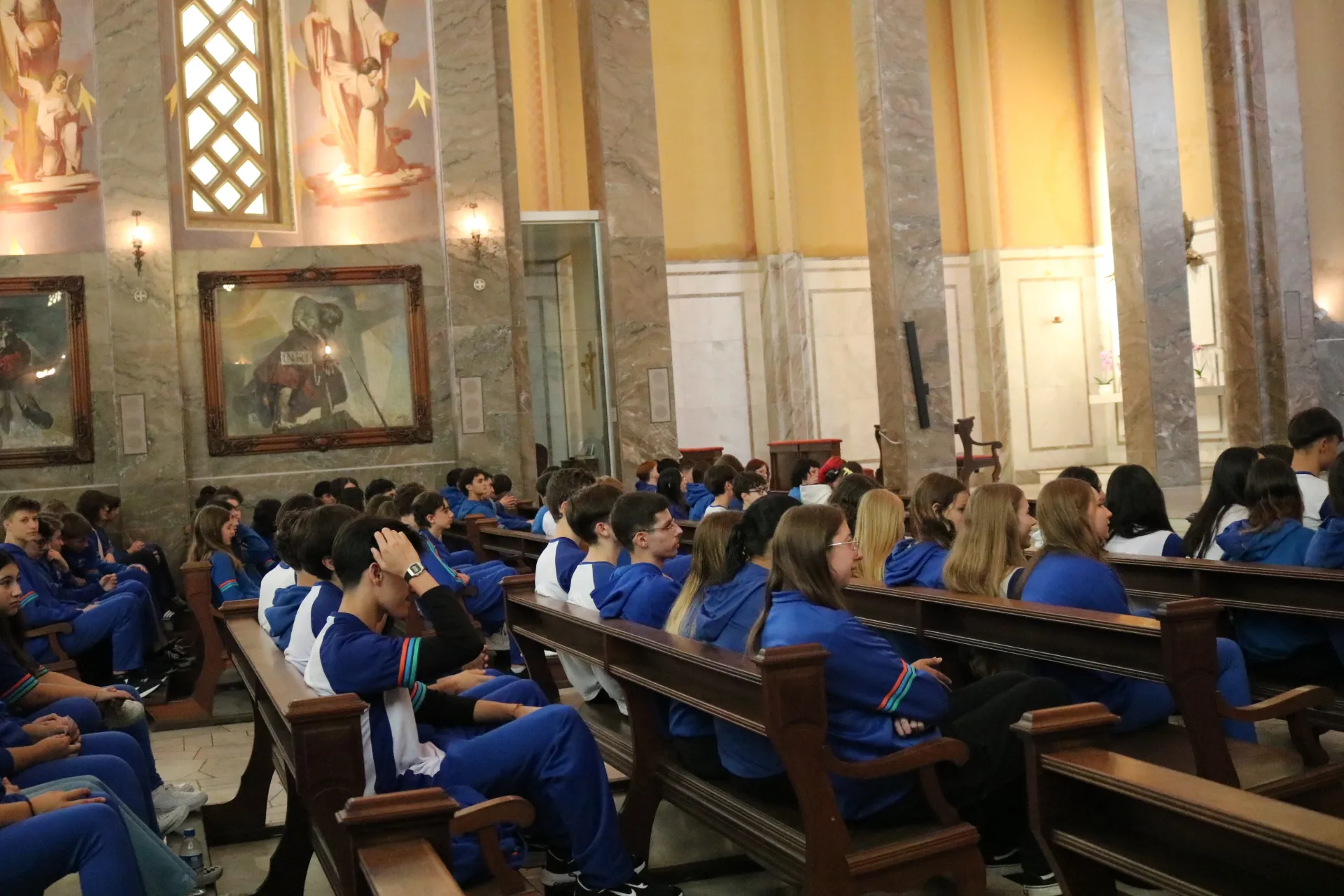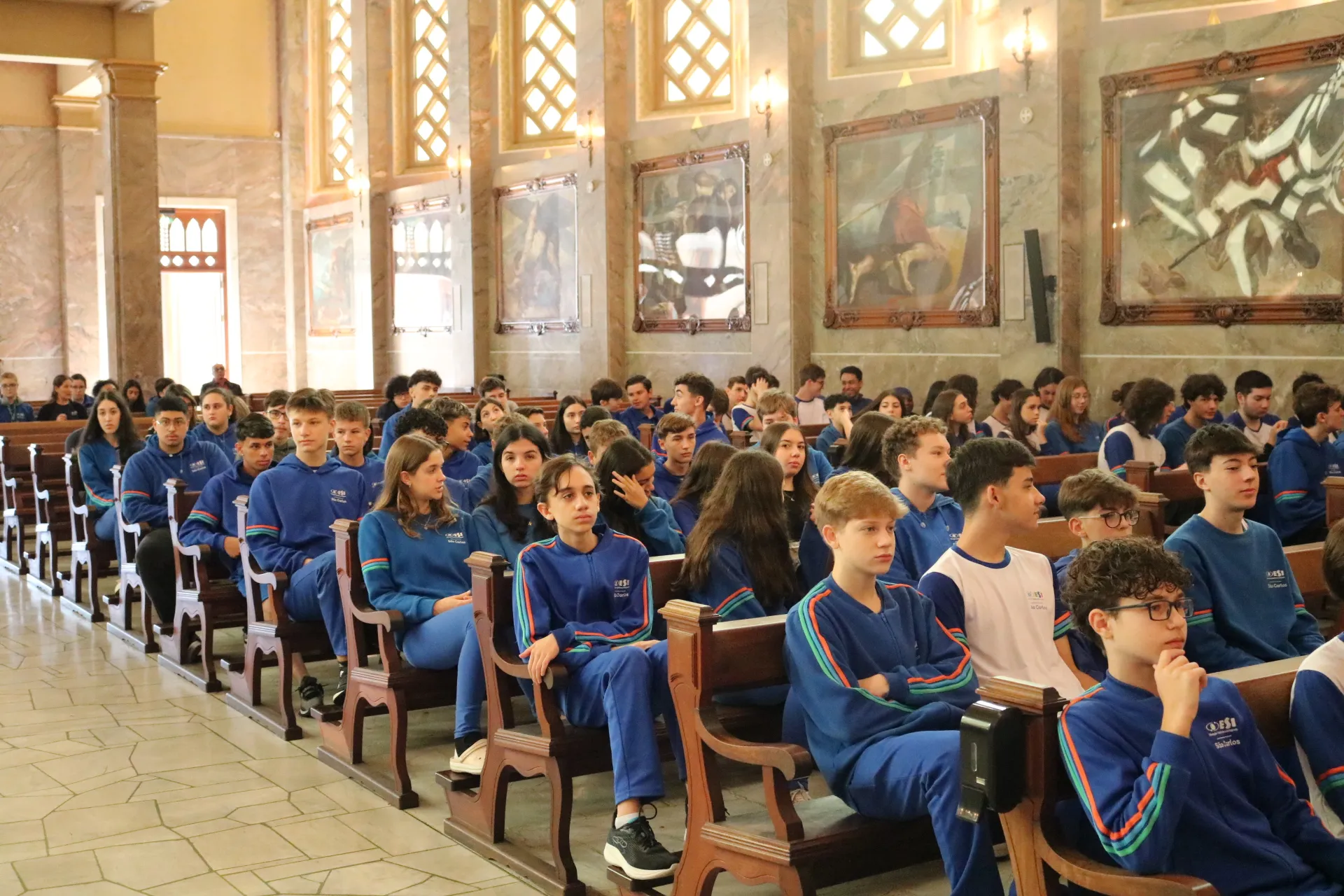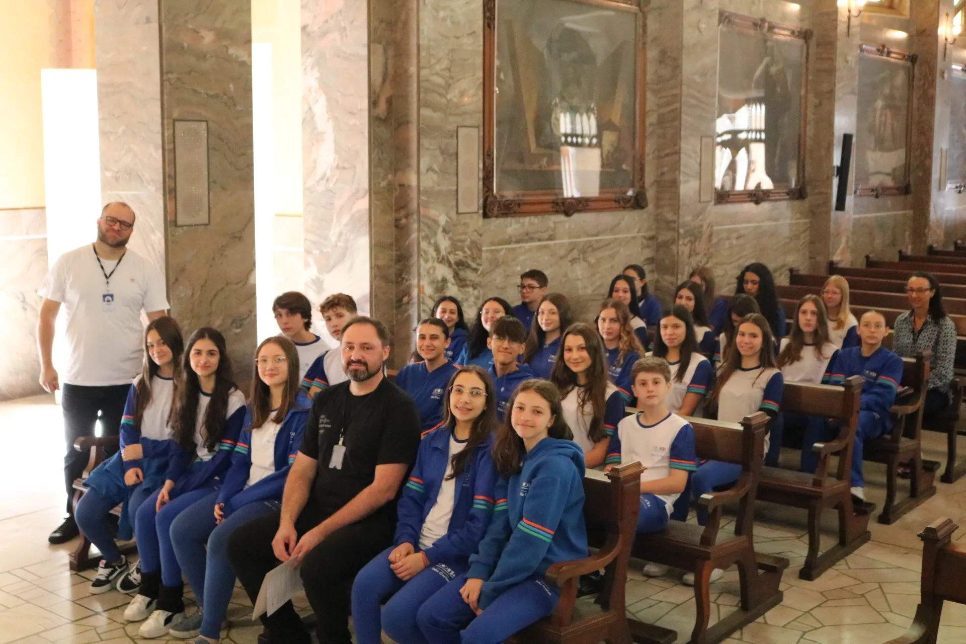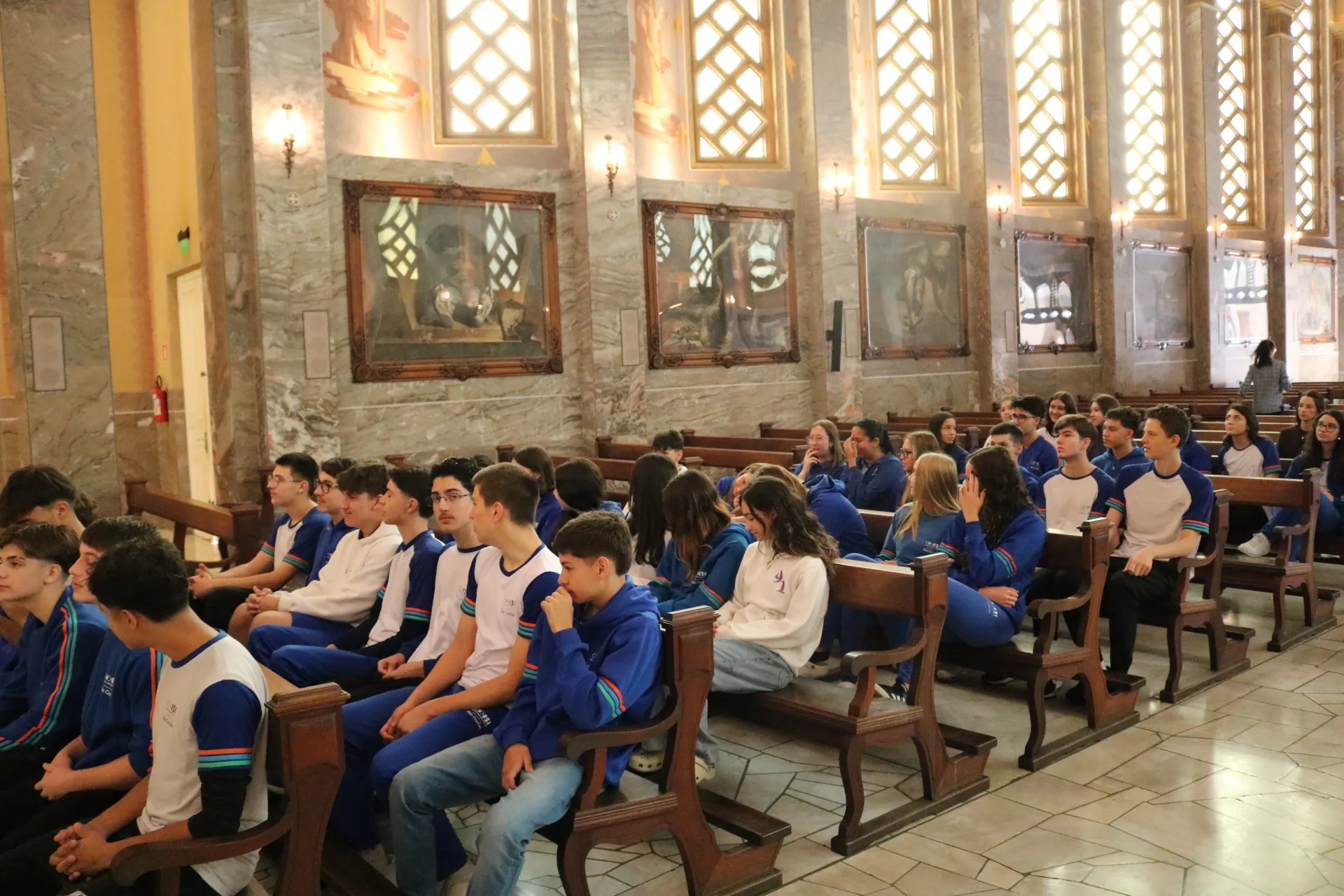 Os estudantes do 9º ano e Ensino Médio também viveram sua celebração de Páscoa na Igreja São Pelegrino, num encontro profundo com o mistério da fé cristã. 🙏🌿