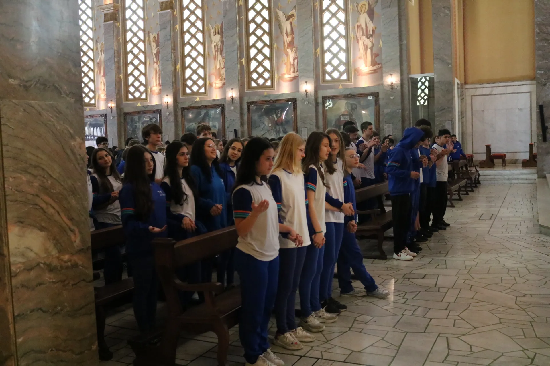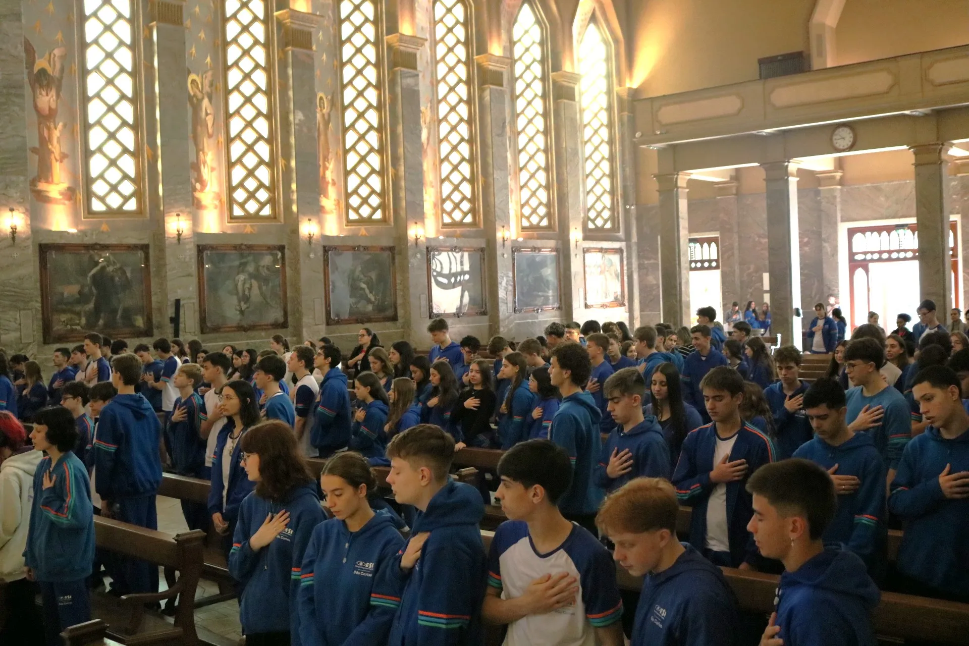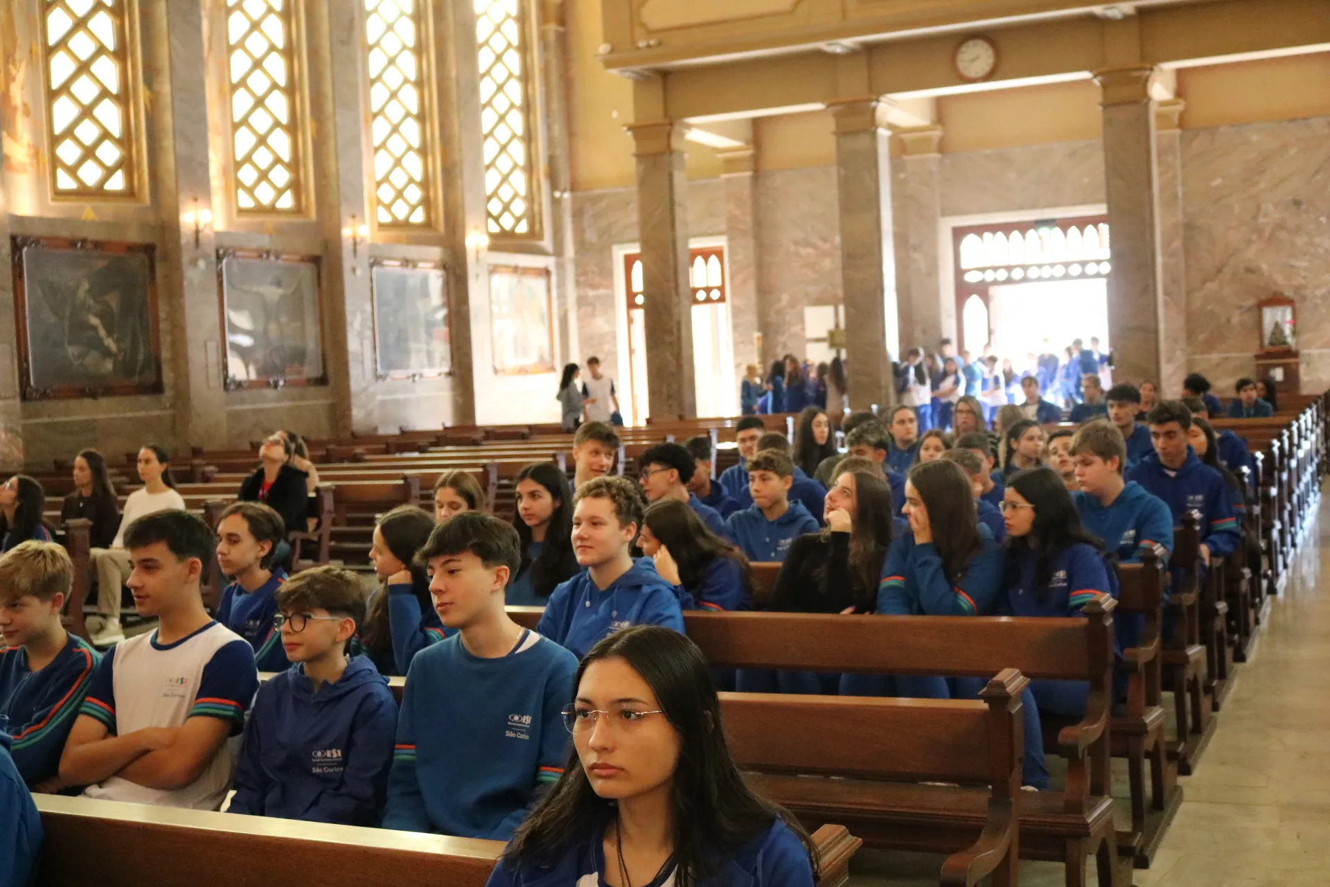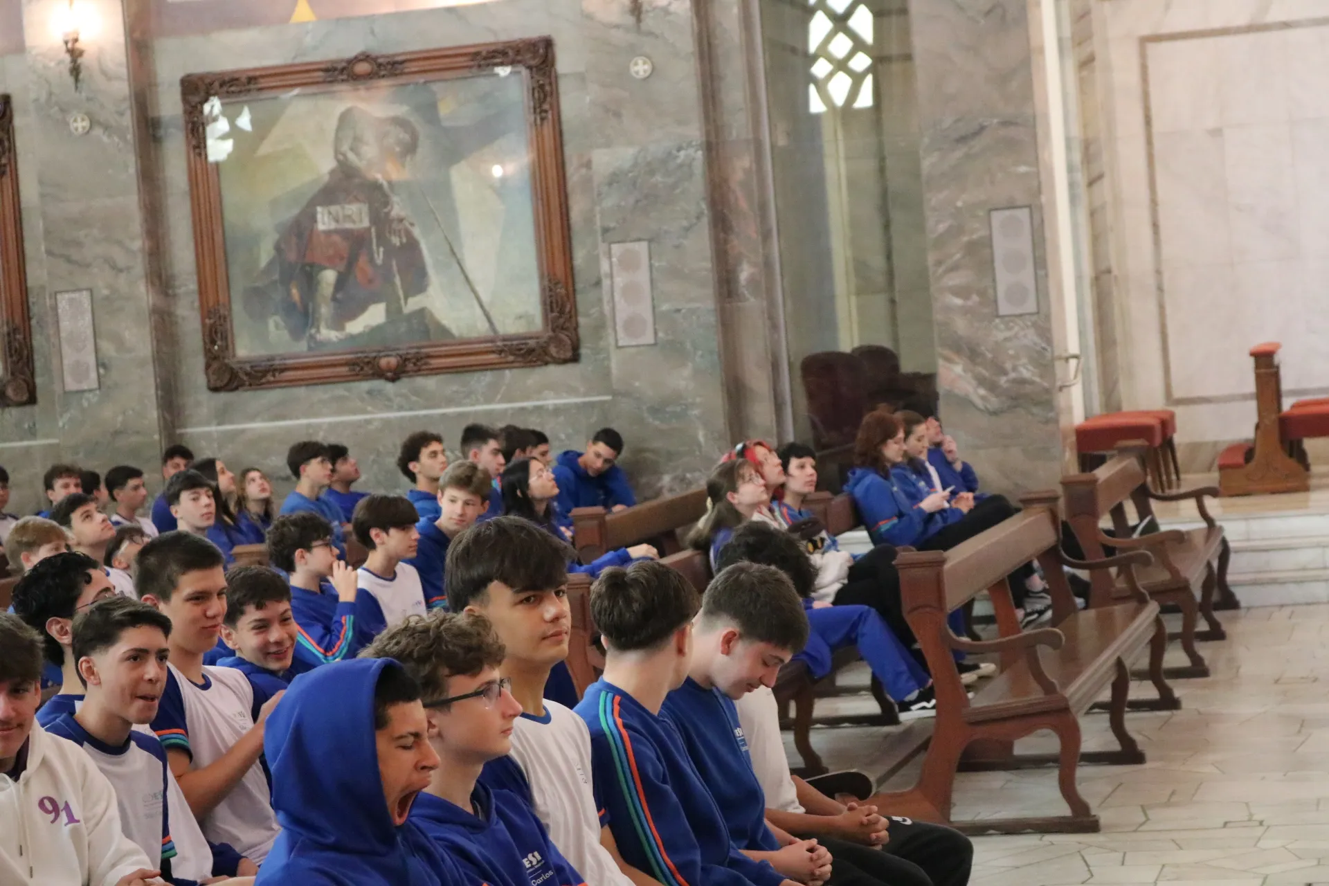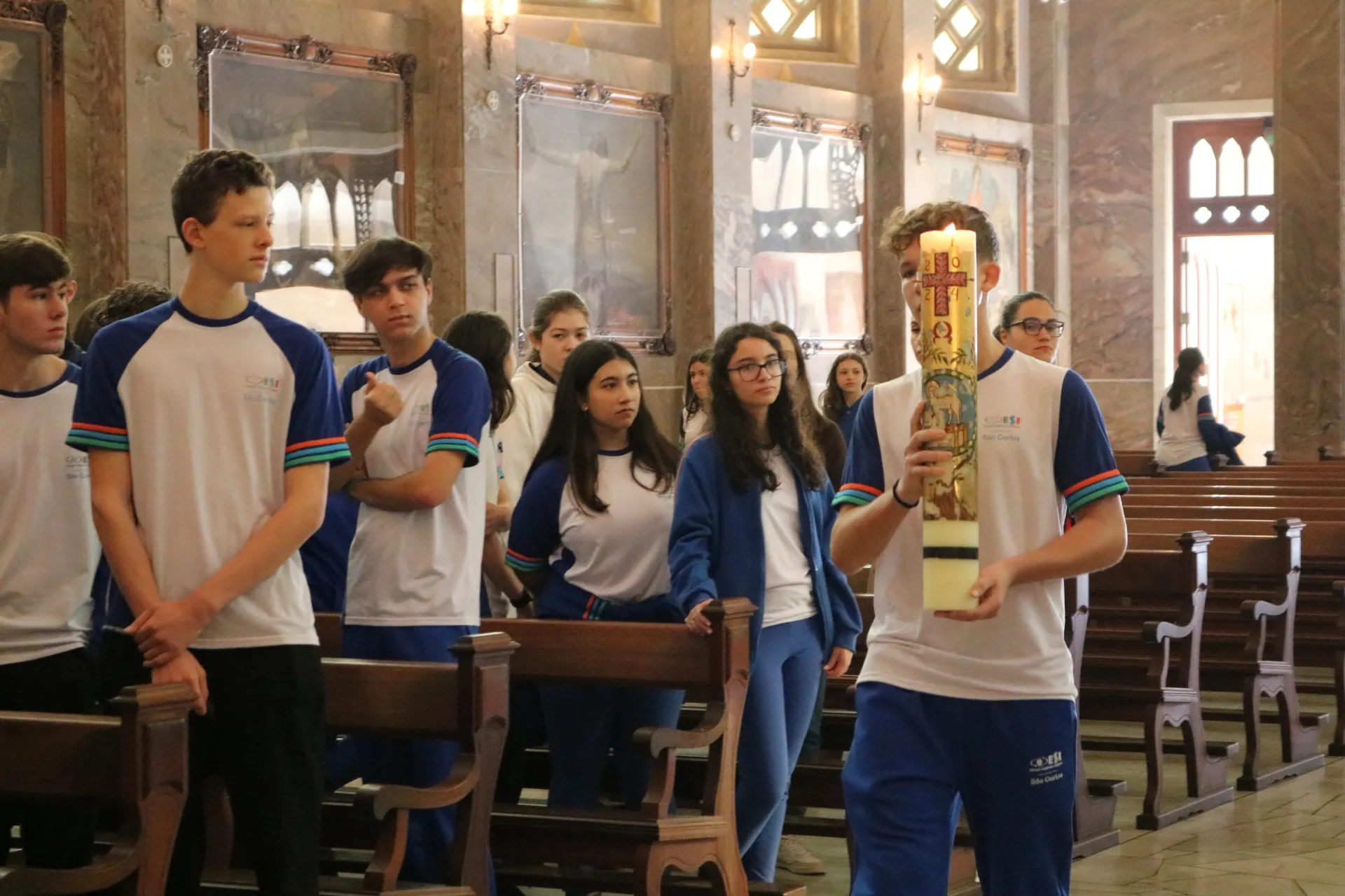 Os estudantes do 9º ano e Ensino Médio também viveram sua celebração de Páscoa na Igreja São Pelegrino, num encontro profundo com o mistério da fé cristã. 🙏🌿