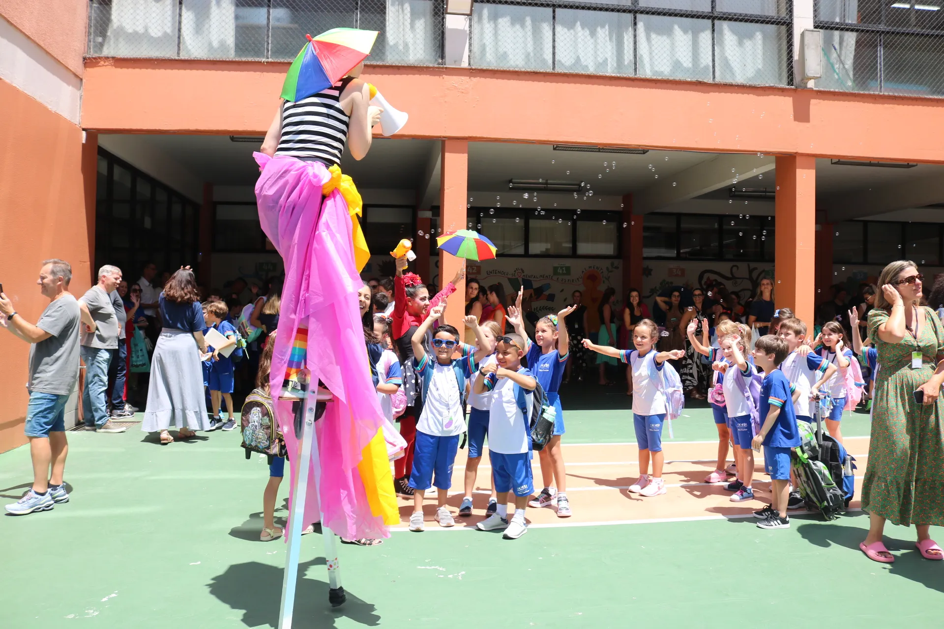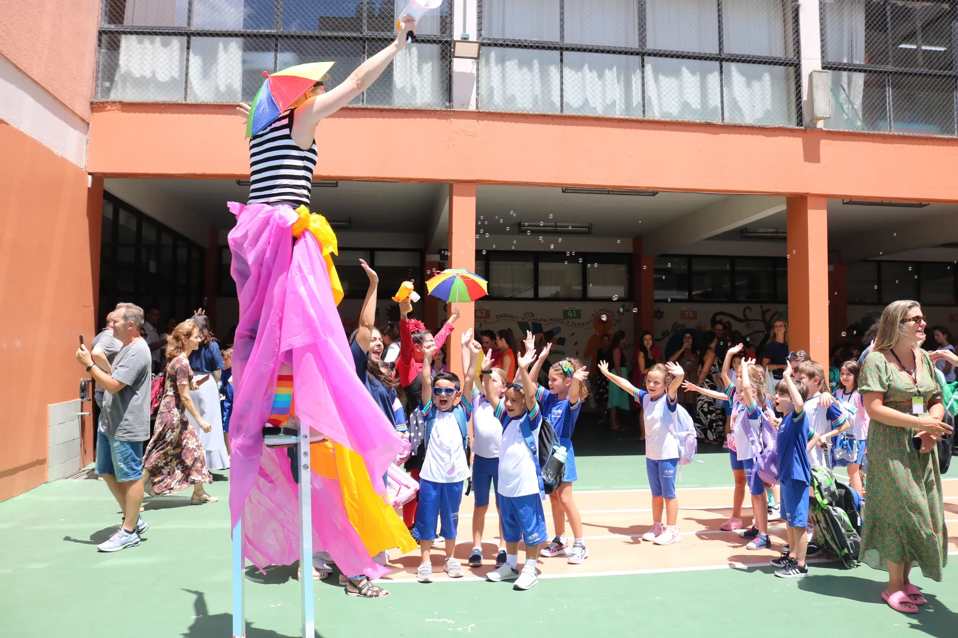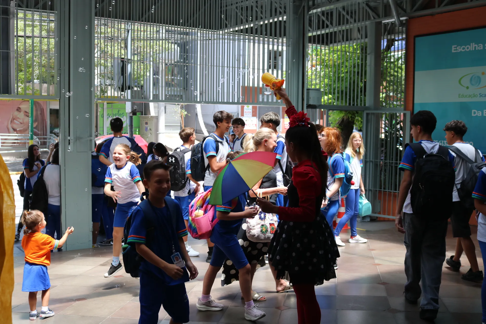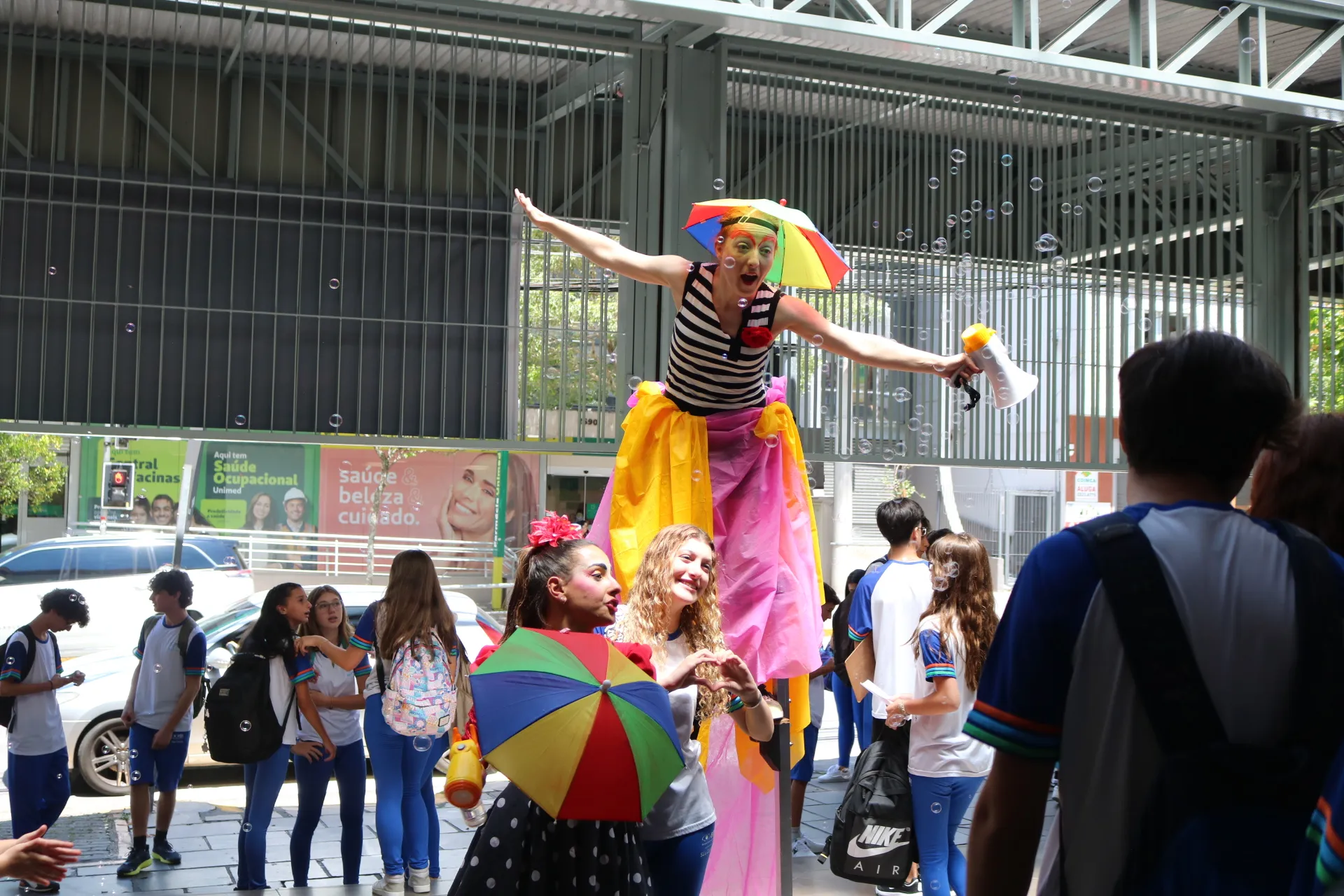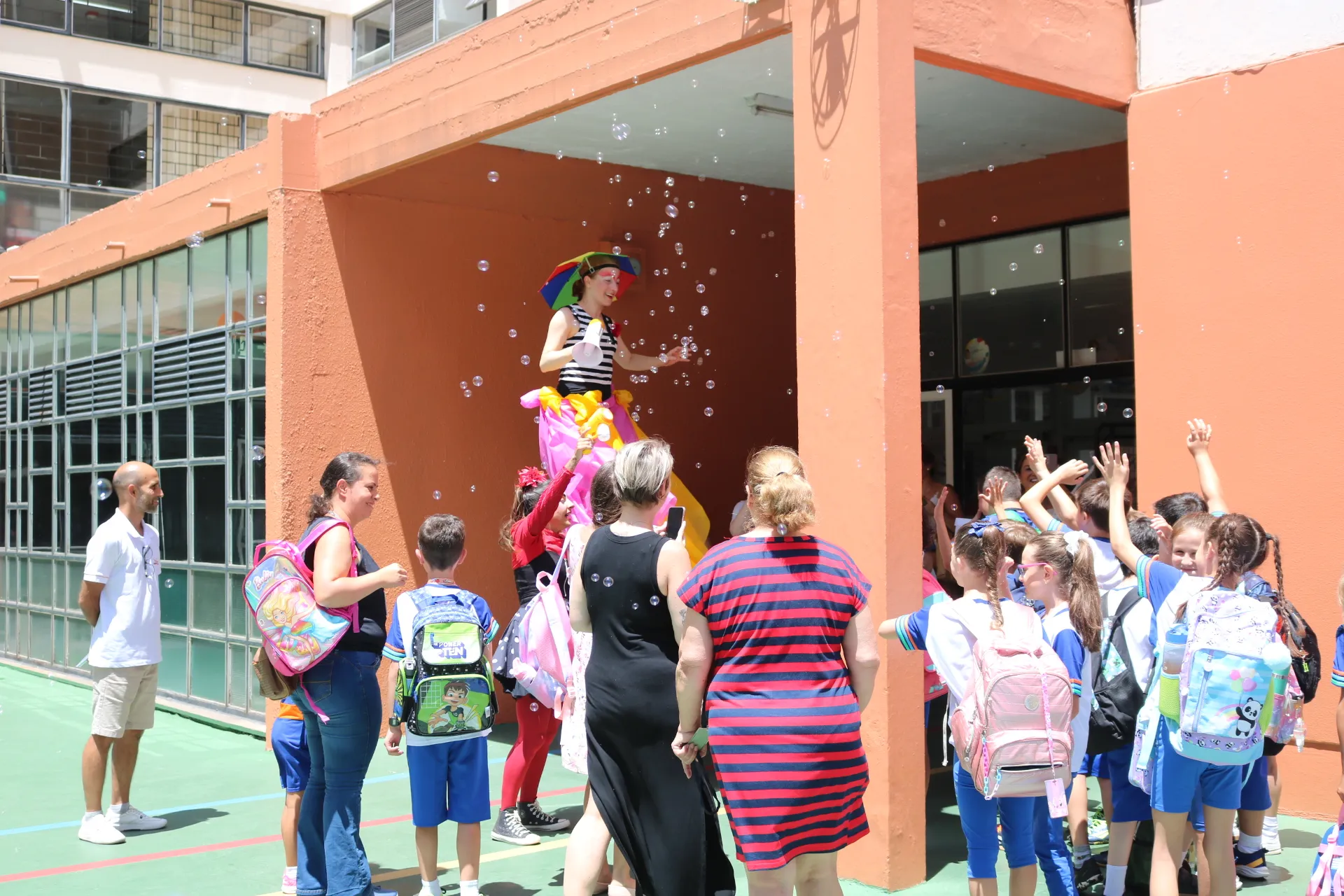 Já na recepção dos alunos da tarde – do Maternal, Educação Infantil e Ensino Fundamental – Anos Iniciais, a magia tomou conta! ✨🎭 Com a energia contagiante das animadoras, pernas de pau e bolhas de sabão, nossos pequenos foram recebidos com muita alegria e encantamento. E claro, a College também esteve presente, tornando o momento ainda mais especial.
